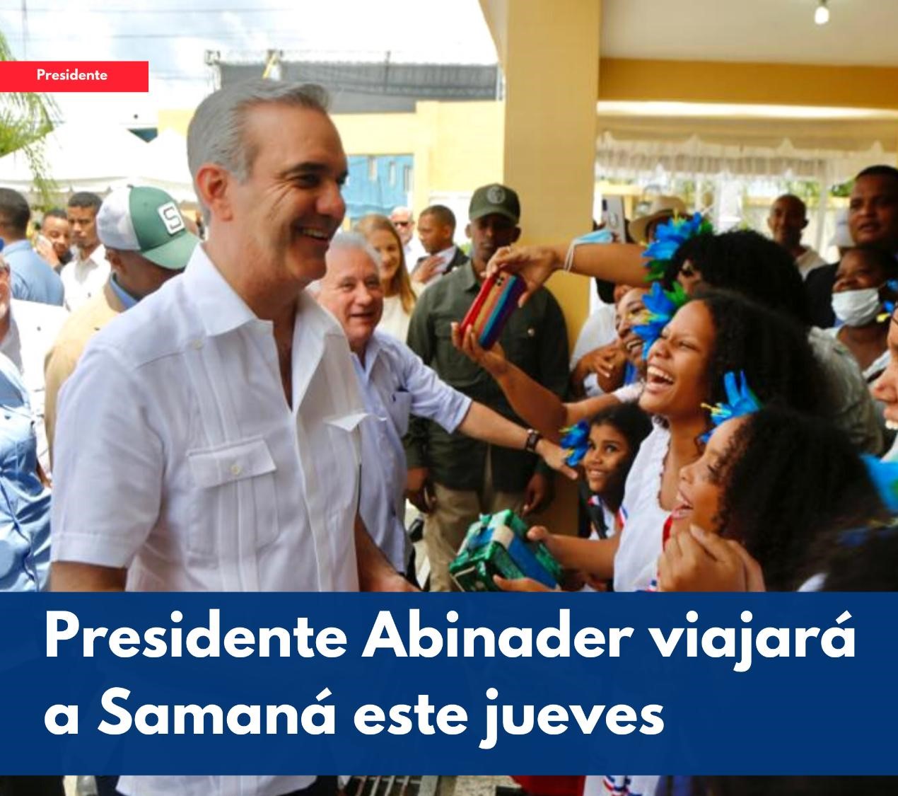 Santo Domingo.- El presidente Luis Abinader se trasladará a la provincia de Samaná este jueves para agotar una agenda en la que dejará iniciados los trabajos para varios muelles y se desarrollará programas sociales del Gobierno que continúan impactando positivamente la vida de los ciudadanos y ciudadanas.