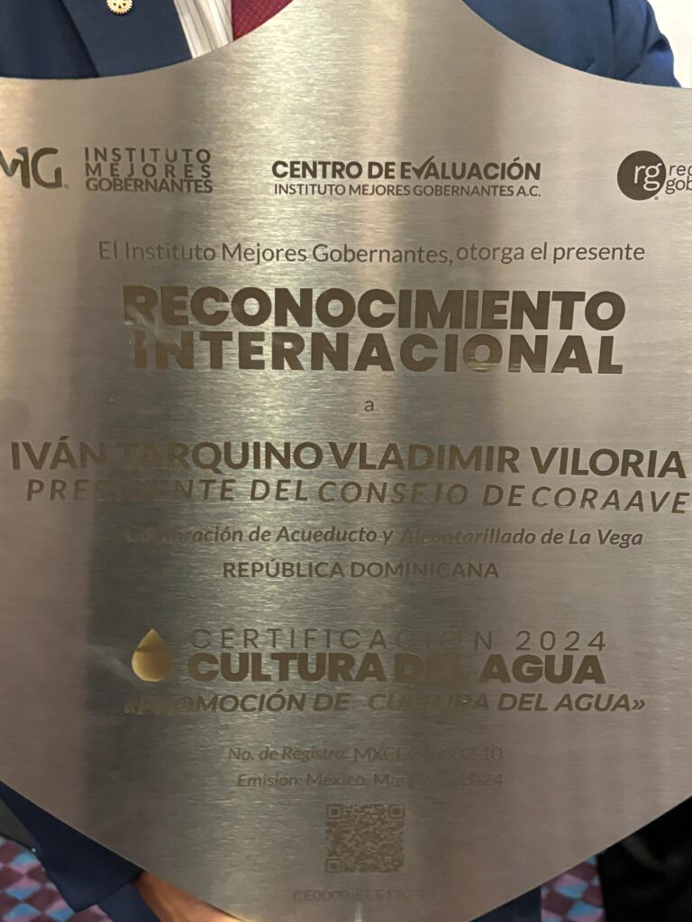 – SOMOS CIBAO.-En una ceremonia realizada en el Hotel Camino Real de la Ciudad de México, el Presidente del Consejo de Administración de CORAAVEGA, Vladimir Viloria, fue honrado con el prestigioso Reconocimiento Internacional «Certificación de Cultura del Agua». Este reconocimiento, otorgado por la Comisión de Selección y Evaluación del Instituto Mejores Gobernantes A.C., el Centro Evaluador CE0009-ECE130-13 de la Secretaría de Educación Pública de la República Mexicana y la plataforma digital Red Gobierno, subraya los esfuerzos excepcionales de Viloria en la optimización de la gestión del agua dentro del marco operativo.
